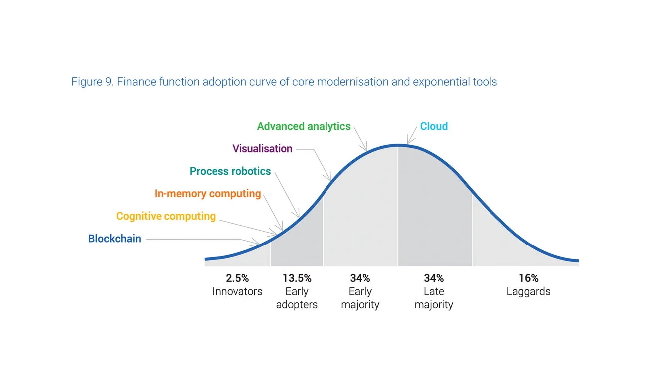 A CIMA study into how well businesses are keeping up with technology revealed the adoption curve above. With process robotics leading in the ‘early adopters’ space, along with blockchain in the ‘innovators’ space, it’s the next tech you need to know as part of your career development.